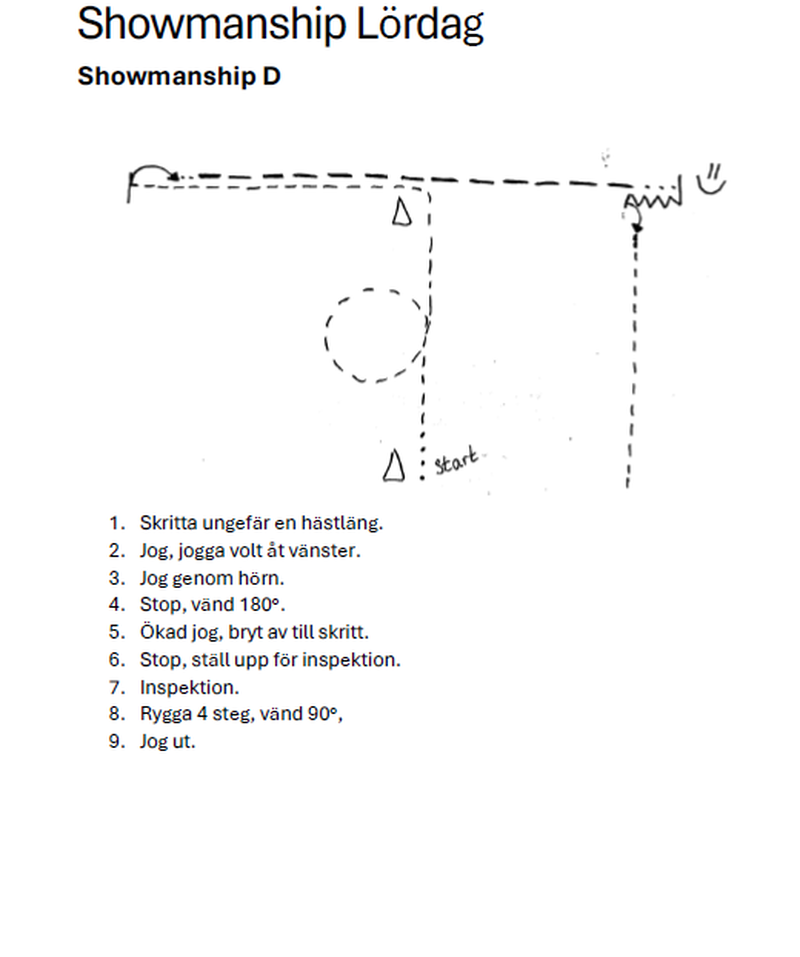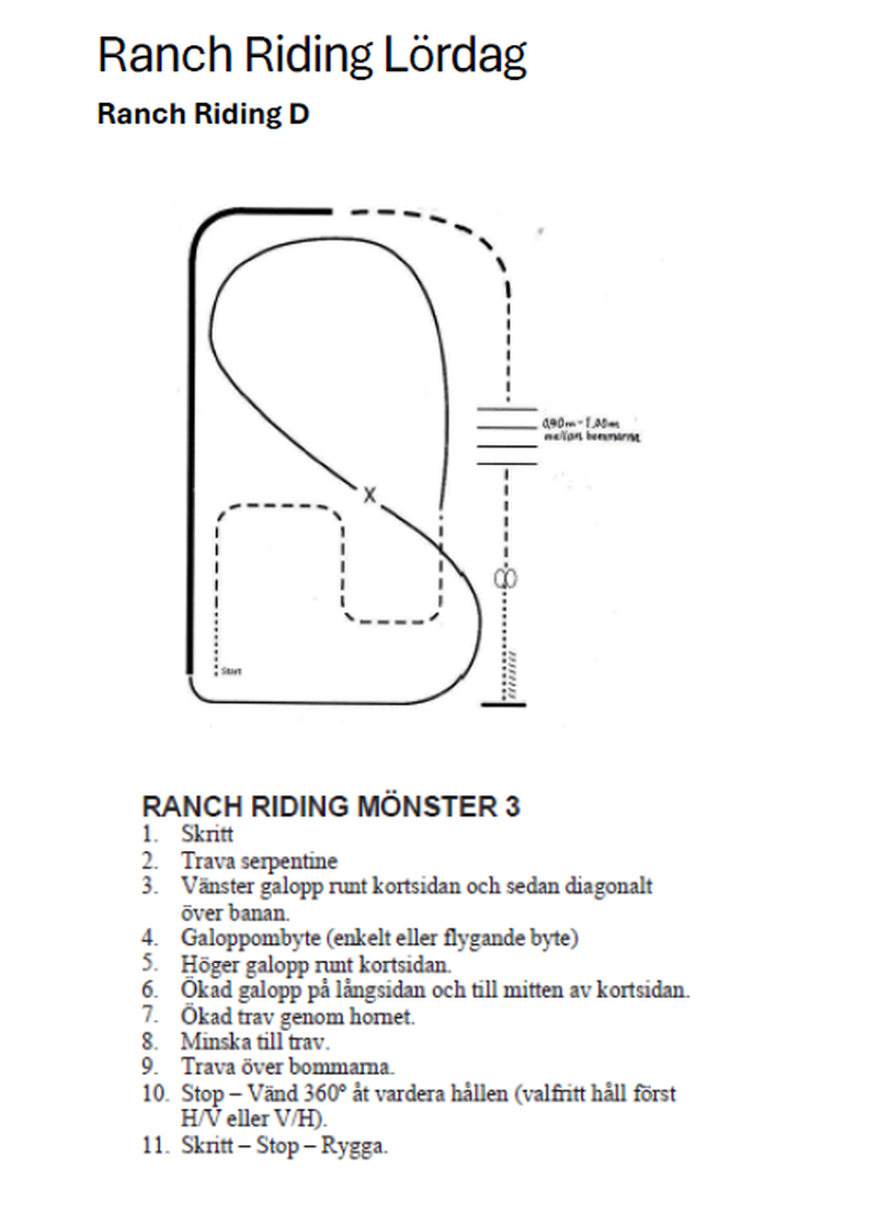 | 26 | Freestyle Reining D Open | Eget mönster. Pris till bästa utklädnad! Det är ok utan huvudlag, en eller två händer, byta hand etc. Ange så fort du kan vilken musik du vill ha... t ex låt på spotify eller egen fil så vi kan få ordning på allt innan tävlingen :-) Obligatoriska rörelser är minst 2 spins till höger och minst 2 spins till vänster, minst 2 stops. (Exempel se reiningmönster 12). (Du startar antingen D-nivå eller C-nivå, inte båda). | 0 | |||||||||||||||||||||||||||