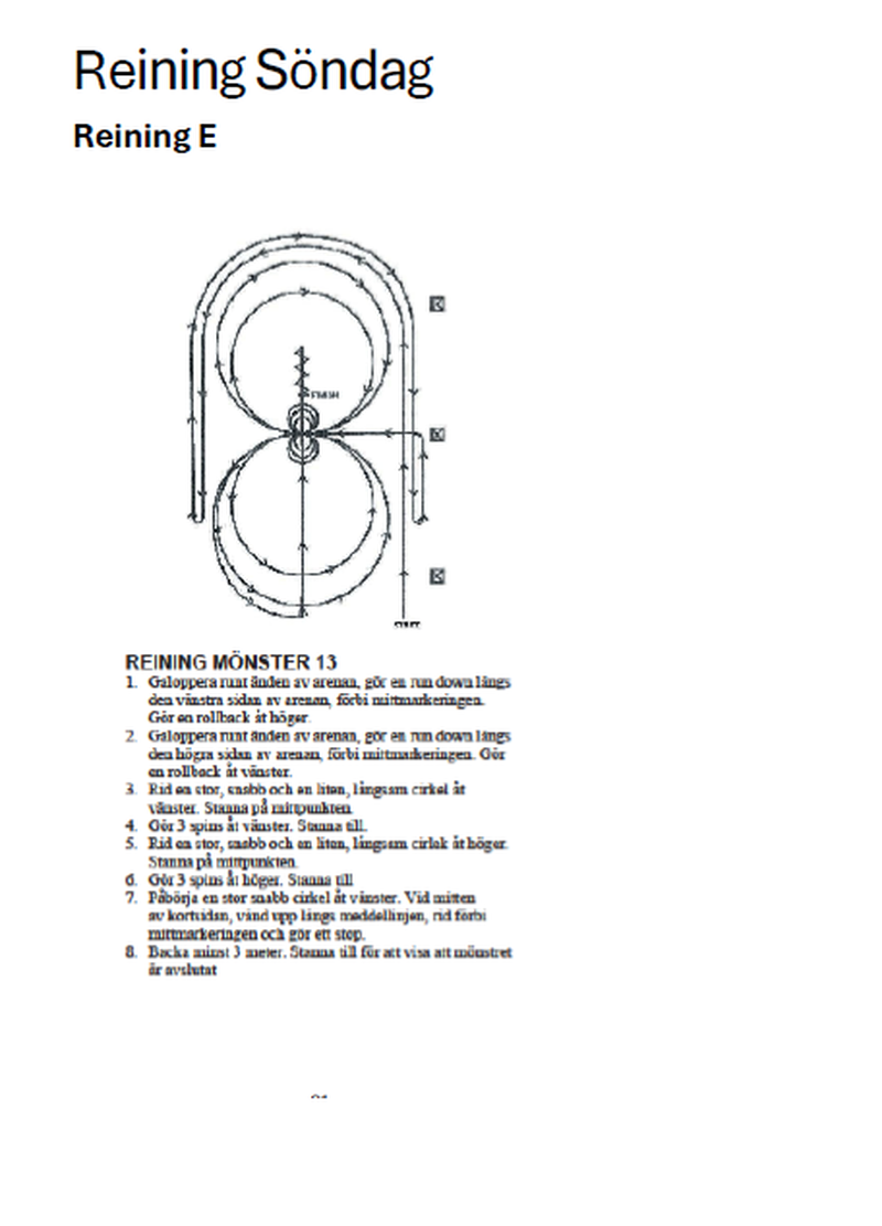 | 21 | Reining D Open | 15 minuters uppvärmning i ridhuset innan den här klassen. Alla reiningekipage samtidigt oavsett klass. OBS! Problem med filer i tävlingssystemet. Samma mönster (Reiningmönster 12) som klass 12, Reining E. | 4 | |||||||||||||||||||||||||||