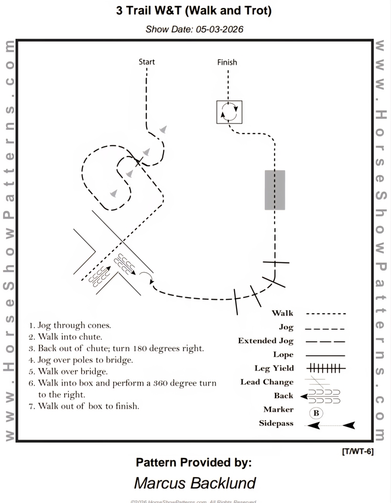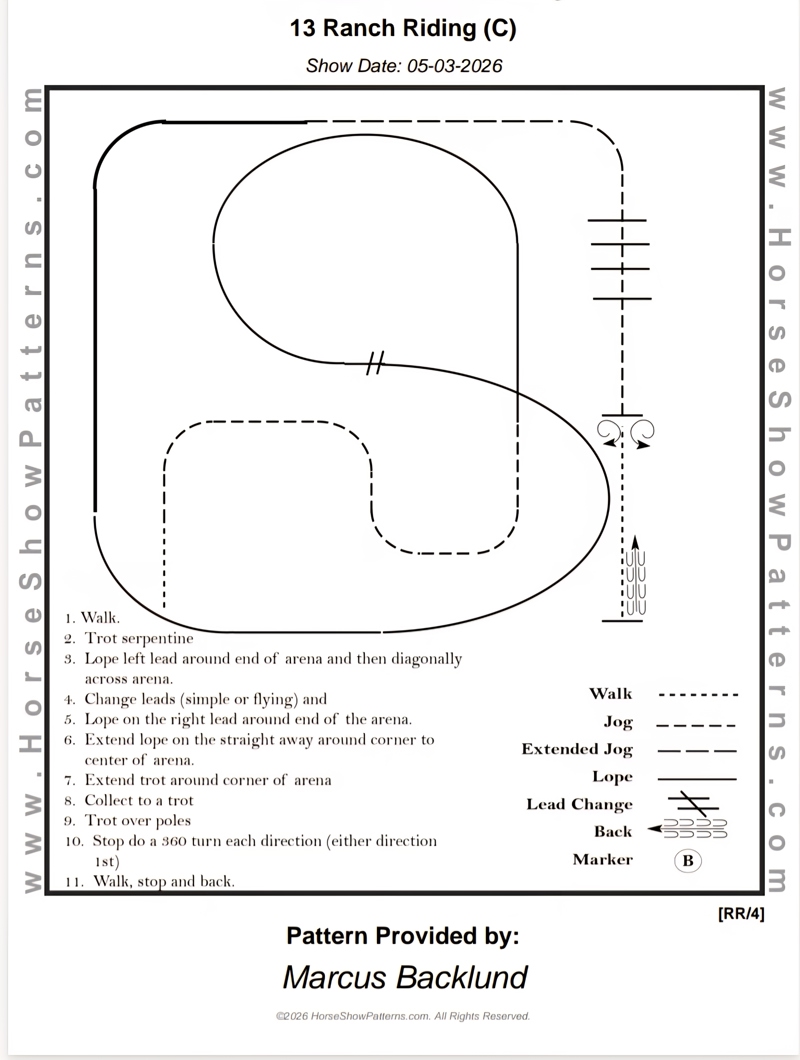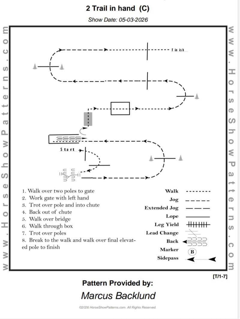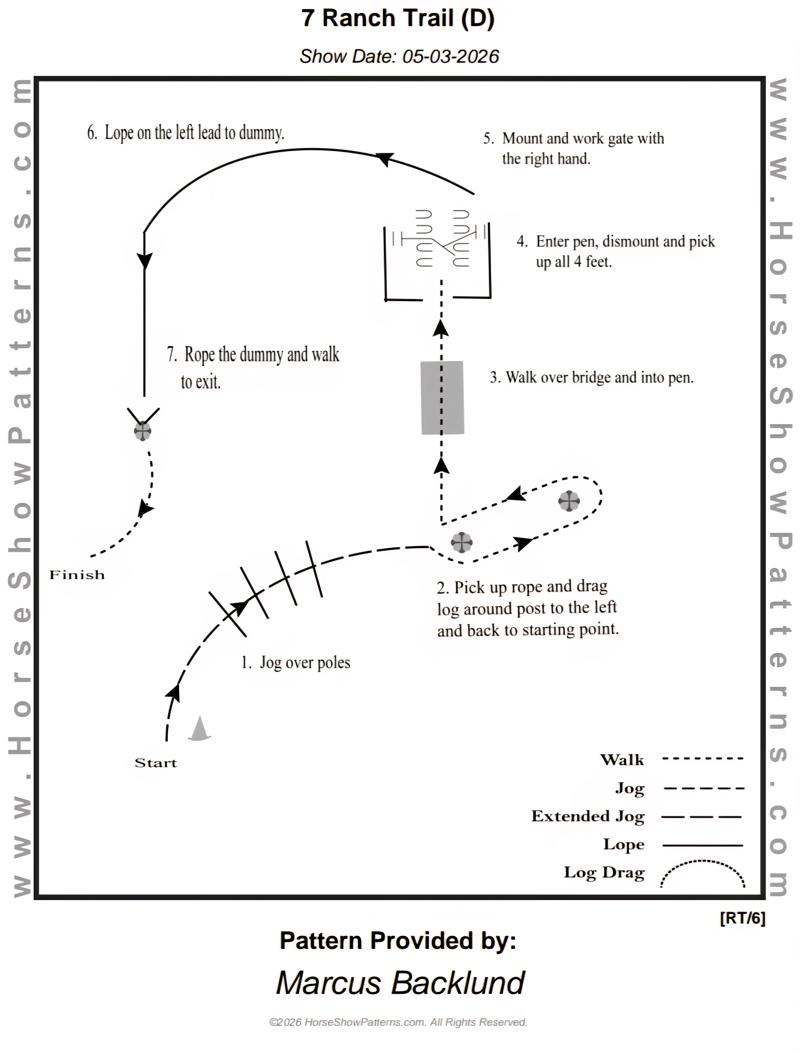 | 6 | Ranch Trail Beginner | Skritt och trav OBS: Där det står galopp i mönstret så är det trav istället! | Beginner | Mönster | 150,- | 100,- | 0 |